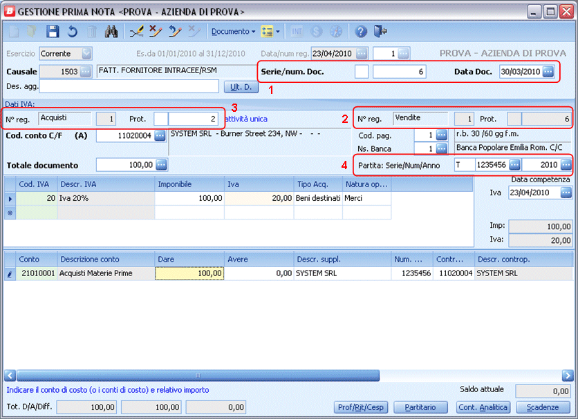 Il numero di partita è obbligatorio qualora per il fornitore sia dichiarata la gestione a partite oppure la gestione dello scadenziario. La registrazione di una fattura di vendita viene effettuata secondo lo stesso criterio (sostituendo opportunamente il fornitore in avere con un cliente in dare , ed il conto di costo in dare con un conto di ricavo in avere). Unica differenza sostanziale è che il numero (e la serie) di protocollo corrisponde (solitamente) al numero documento stesso, che costituisce pertanto il numero progressivo da riportare sul registro IVA vendite. 2 - Fattura di acquisto con due aliquote e due contropartite di costo con aggiornamento dello scadenziario passivo: Totale documento : 150,00 Impon. 10% : 100,00 IVA 10,00 Impon. 20% : 33,33 IVA 6,67 Acquisti : 100000 Spese : 4000 Pagamento: RB 30/60 gg F.M.