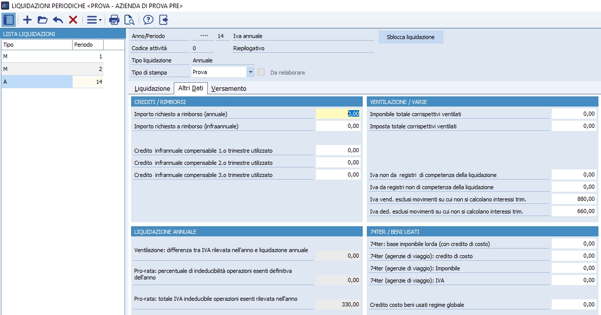 Se non sono eseguite le liquidazioni fino a novembre in definitiva, dopo aver eseguito la liquidazione annuale ed aggiornato l'Anagrafica ditta, tutte le liquidazioni eventualmente rielaborate fino a novembre saranno eseguite con la % di pro-rata definitiva.