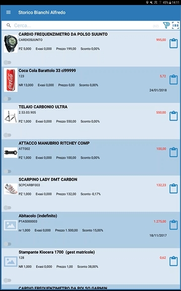 Come già visto per i documenti del cliente, gli articoli visualizzati sono quelli presenti in documenti con data di ordine da oggi a ritroso fino al numero di mesi impostato nel programma BNUPCONF relativi all'agente (nel nostro caso 8 mesi per gli ordini e 9 mesi per i documenti antecedenti la data odierna) Nello storico vengono visualizzati gli articoli ordinati dal cliente a cui l'agente ha accesso, e non più solamente gli ordini generati dall'agente con BusinessUP (e che quindi hanno il riferimento "Rif. ordine app.: [CODICE AGENTE]- [CHIAVE DOCUMENTO]"). Lo storico opera in due modalità di ricalcolo prezzi (la modalità viene scelta nel programma di configurazione BNUPCONF - Utilizza