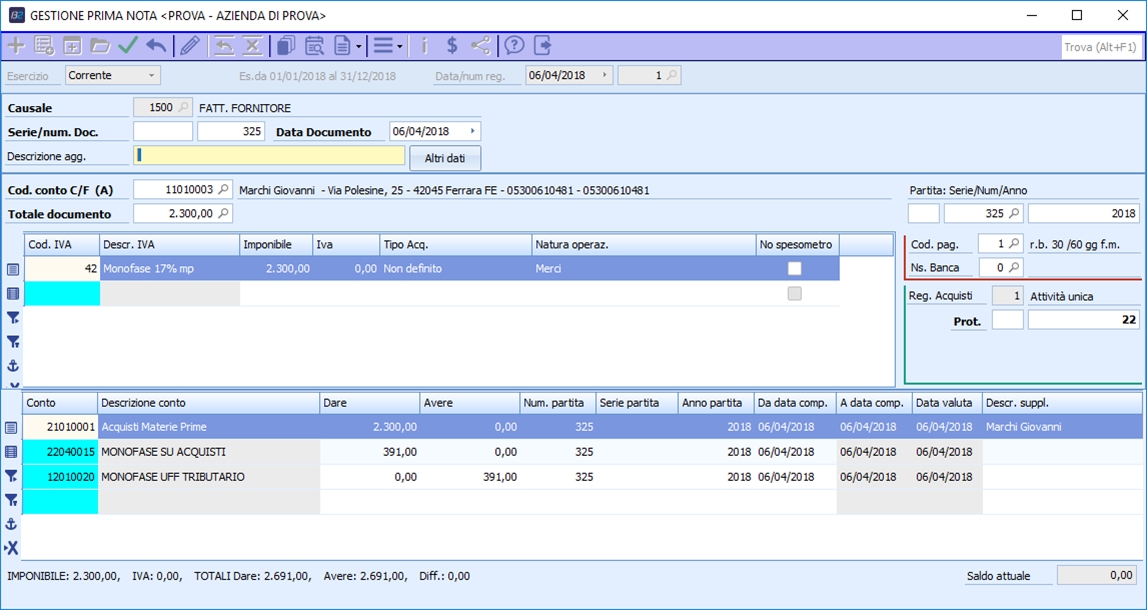 2.2. Al salvataggio vengono aggiunte in coda alla registrazione le righe del costo per l'imposta monofase (sulla base dei dati del castelletto iva) e per il debito verso Ufficio Tributari