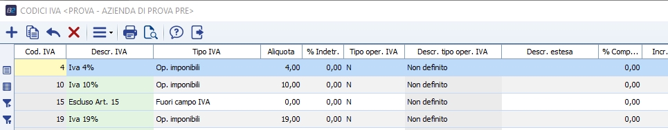 Tipo IVA Selezionare una voce dall'elenco a tendina che identifica il tipo di operazioni a cui si riferisce. Ogni "Codice IVA" va riferito ad un Tipo Iva: