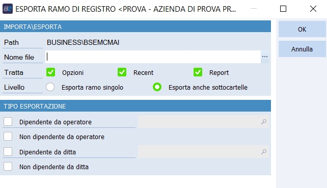 • Esporta/Importa ramo Esporta o importa un ramo e, a scelta, i rami figli e le proprietà in esso contenute. Per esempio per esportare tutte le impostazioni dell'intero registro di Business procedere selezionando la root Business e poi dal menu Strumenti scegliere Esporta ramo: