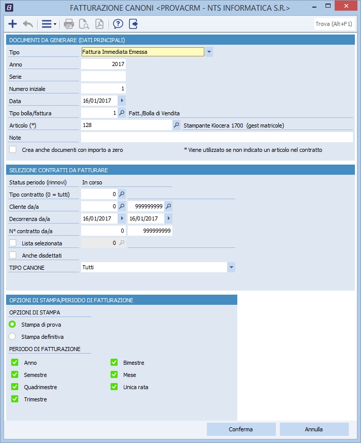 Spuntare le caselle relative ai rinnovi che hanno quel (o quel tipo di) periodo/i di fatturazione. Per es, fatturare solo i contratti / rinnovi con fatturazione annuale.