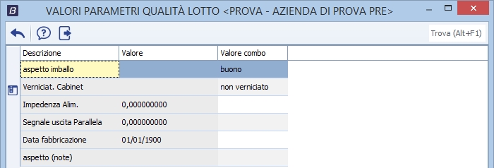 Parametri qualità lotto Se inserito il codice parametro qualità lotto, visualizza/modifica i valori che possono essere assunti da tale parametro.