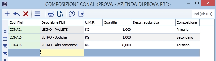 Attivo solo se l'articolo ha Applicazione CONAI = Prima cessione. Apre una finestra in cui è possibile inserire il codice degli articoli che identificano i materiali soggetti a Conai con le relative quantità. Questi articoli devono avere il codice articolo che inizia per CONAI e l'unità di misura = Kg. Il campo 'composizione' è ereditato e modificabile nei documenti di magazzino nel 'dettaglio conai' e permette di effettuare dei raggruppamenti in fase di stampa del programma 'Stampa dati conai'.