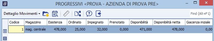 NB: lanciando la ricostruzione dei progressivi verranno sovrascritti eventuali dati modificati manualmente, come 'Ultimo Costo', 'Ultimo costo + spese acc.' E 'Ultimo Prezzo'. Progressivi Apre una griglia che visualizza, divise per magazzino, le quantità impegnate, ordinate, le giacenze ecc. Nellla finestra sono presenti le funzioni: