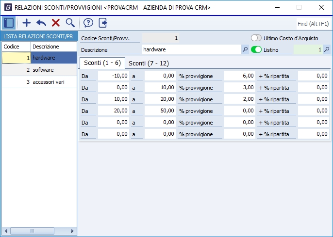 Codice Sconti/Provv. - Descrizione Il Codice della relazione Sconto/Provvigione stabilisce a quale classe Provvigione di articoli la relazione si riferisce. Ad esempio, se s'inserisce una relazione con codice 7, ciò implica che i dati (tipo Da, A, Sconto) si riferiscono solo agli articoli appartenenti alla classe provvigioni 7. In alternativa, settando l'opzione di registro di Business BSVEBOLL\OPZIONI\Opzscpr = CodiceAgente, è possibile associare il cod. relazione sconto/provvigione al codice agente. In tal caso vanno inseriti tanti record in questa tabella per quanti sono gli agenti che hanno provvigioni calcolate con relazioni sconto/provvigione. In ulteriore alternativa, settando la citata opzione Opzscpr = AgenteClasseArticolo, è possibile associare il codice relazione sconto/provvigione sia al codice agente che alla classe di provvigione dell'articolo. In tal caso in questa tabella vanno inseriti tanti record quante sono le combinazioni agenti/classi articoli, per gli agenti quelli con provvigioni calcolate con relazioni sconto/provvigione. Il codice relazione sconto provvigioni dev'essere di 3 o 4 cifre, del tipo AACC dove AA=cod. agente, CC=classe provv. articolo. Ultimo costo d'acquisto / Listino Attraverso queste opzioni, alternative tra loro, possiamo stabilire se confrontare il prezzo effettivo di vendita con l'ultimo costo d'acquisto o con un listino e quindi ricavare lo sconto sulla cui base s'ottiene la percentuale di provvigione, che se negativo coincide con un ricarico. Per prezzo effettivo di vendita s'intende il prezzo lordo decurtato di tutti gli sconti applicati, escluso lo sconto pagamento. Se è inserito un "Listino" o impostato il flag su "Ultimo Costo", il programma confronta il prezzo di vendita con uno dei due parametri inseriti per stabilire lo sconto effettivo applicato e di conseguenza la provvigione da applicare. Se abilitata l'opzione generale di registro di Business "ProvvRelazScontiNoListino=-1", confronta il prezzo di vendita col valore della riga (Prezzo*Quantità-Sconti) e le provvigioni sono calcolate sulla base di questo valore. Da, A, % provvigione , % ripartita In queste 12 righe s'inseriscono altrettanti scaglioni di sconto, i cui estremi si indicano nei campi "Da:" "a:", a ciascuno dei quali dev'essere applicata una percentuale di provvigione e una percentuale di ripartita. Per informazioni dettagliate in merito, vedi la sezione relativa a "Impostazione calcolo provvigioni" in "Argomenti e moduli". |