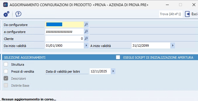 Questo programma permette di riallineare Prezzi di vendita, Descrizioni, Descrizioni in Lingua e Composizione Distinta base degli articoli già configurati in precedenza utilizzando i configuratori selezionati dai filtri di elaborazione .