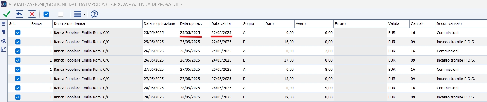 In questo caso non è stato segnalato alcun errore, se si clicca sul pulsante 'Salva' della toolbar, i record vengono importati. Da questa maschera è possibile modificare tutti i dati, cancellare una o più righe, oppure rinunciare completamente all'import semplicemente uscendo senza salvare (viene richiesta conferma). Nell'eventualità di movimenti con uno o più errori, vengono segnalati su sfondo rosso e l'ultima colonna a destra della griglia contiene la descrizione del problema rilevato: