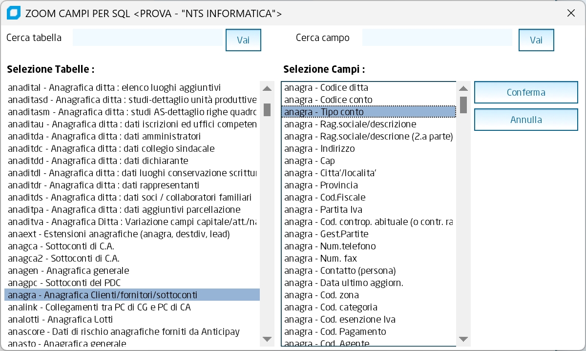 L'inserimento di un filtro utente ha inizio specificando il campo a cui si riferisce utilizzando la funzione di zoom e selezionando ivi la tabella, a cui il campo appartiene, e poi il campo stesso.