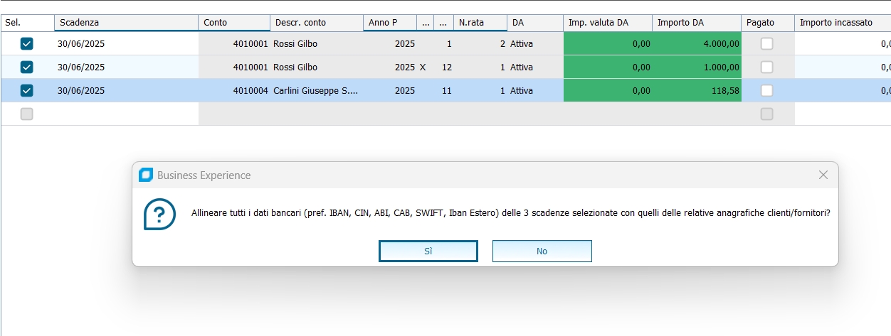 La gestione scadenzario verifica, prima di iniziare a generare la registrazione, che il totale scadenze DARE sia uguale al totale scadenze AVERE. Per semplificare ulteriormente la gestione delle scadenze con la funzione di compensazione tra fatture ed acconti/note di accredito, se il totale dare dei documenti da compensare è diverso dal totale avere e si sta compensando una sola nota di accredito, oppure un solo acconto e l'importo di uno di questi documenti supera il totale delle fatture spuntate, viene fatta la domanda se spezzare la scadenza e proseguire, invece di avvisare che l'operatore prima deve spezzare le scadenze in modo che il totale dare sia uguale al totale avere. Inoltre se l'importo delle fatture spuntate supera l'importo degli acconti/note di accredito e la fattura con scadenza di importo più alto può essere spezzata per poter raggiungere la quadratura tra totale DARE e totale AVERE, chiede se spezzare la scadenza e continuare con la compensazione invece di avvisare di eseguire lo 'spezza scadenze' a mano. Al termine del raggruppamento viene fatto un aggiornamento della griglia delle scadenze. Non possono essere compensati acconti con fatture e note di accredito tutte in una unica soluzione, visto che per l'acconto si modifica la registrazione originaria, mentre per la nota di accredito si crea una nuova registrazione. Per la compensazione con acconti, se la registrazione originaria risulta essere già stampata sul libro giornale viene chiesto se creare una nuova registrazione oppure abortire l'operazione. La nuova registrazione è creata con esercizio uguale all'esercizio corrente, data registrazione pari alla data del giorno e causale contabile indicata in Personalizzazione contabilità generale al campo "Causale compensazione partite tra clienti o fornitori", che dev'essere di tipo "Saldo scadenze". Per acconti/note accredito clienti sono intese le scadenze clienti con DAREVE= "A" (non DARAVE = "D" e importo negativo) e per acconti/note accredito fornitori sono intese le scadenze fornitori con DAREVE= "D" (non DARAVE = "A" e importo positivo). Quando l'operatore compensa due scadenze di segno opposto, come ad esempio fattura e nota di accredito oppure fattura e acconto, non é più obbligatorio spezzare preventivamente la rata di importo più alto in modo che le due scadenze da compensare siano uguali. Una volta selezionate le rate infatti, il programma chiede all'operatore se vuole spezzare la scadenza di importo più alto e proseguire. Unifica scadenze spezzate per errore Per utilizzarla occorre selezionare le due scadenze da unificare, quindi selezionare la nuova voce di menu. La scadenza con numero di rata più basso sarà mantenuta ed aggiornata con gli importi della scadenza con rata più alta, che sarà cancellata. Aggiorna dati bancari anagrafica cli/forn Selezionando le scadenze in griglia e richiamando tale funzione, viene chiesto all'utente se allineare i dati bancari della scadenza (pref. IBAN, CIN, ABI, CAB, SWIFT, Iban Estero) con quelli presenti sul conto cliente/fornitore della scadenza.