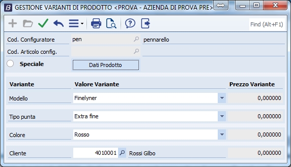 Impostazione Varianti di Prodotto Occorre creare l'anagrafica dell'articolo modello esattamente come per il configuratore di prodotto (tipo opzione 'PF/SL Neutro' se dotato di distinta base, 'MP neutra' altrimenti).