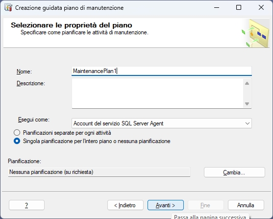 Nella pagina di Selezione delle proprietà del piano indicare un Nome del piano e scegliere Singola pianificazione per l'intero piano