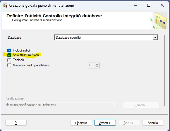 Dettaglio per la creazione di un piano di manutenzione da SSMS per effettuare il controllo integrità database