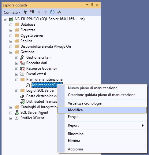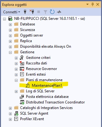 Piano di manutenzione che troviamo ovviamente anche in SSMS sotto a SQL Agent\Processi