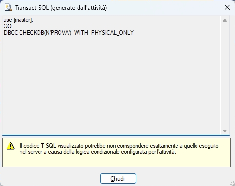 Se guardiamo con il pulsante Visualizza T-SQL tale flag quando impostato aggiunge al comando DBCC CHECKDB il parametro WITH PHYSICAL ONLY