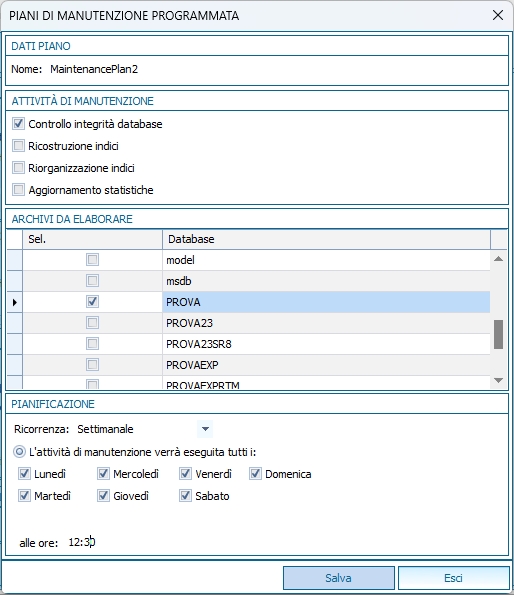 In questa sezione, una volta selezionato il database interessato, sarà possibile avere una maschera di selezione delle attività, data\ora\periodicità della stessa, che verrà inserita nei piani di manutenzione dell'Agent di SQL Server