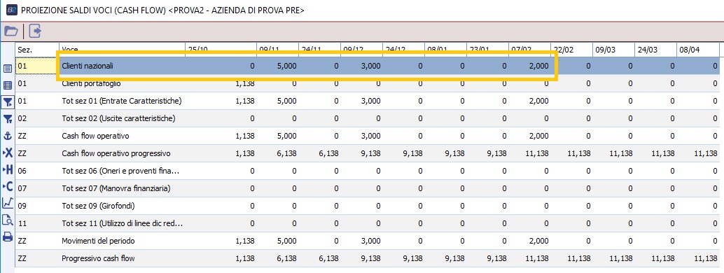 Mentre la stampa Proiezione saldi voci (cash flow) si comporta in questo modo: