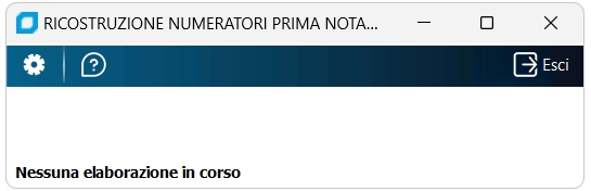 L'esecuzione dell'elaborazione del programma determina la ricostruzione dei progressivi numeratori e delle date della tabella di prima nota, prima di procedere occorre accertarsi che nessun utente stia lavorando in contabilità.