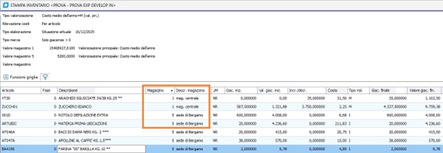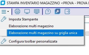 Calcola anche carichi e scarichi, Attivo solo per il tipo elaborazione "Situazione Attuale" oppure "A Data"; permette di rappresentare su specifiche colonne in griglia anche il totale dei carichi ed il totale dei carichi rilevati nel periodo compreso tra la Data ultimo aggiornamento progressivi definitivi e la Data Inventario. Menù Strumenti - Elaborazione multi magazzino Permette l'elaborazione multi magazzino della stampa inventario vincolata alle contestuali condizioni illustrate a video. Menù Strumenti - Elaborazione multi magazzino griglia unica Permette di stampare la giacenza di più mgazzini selezionati in un unica griglia evidenziando la giacenza per ogni articolo/magazzino