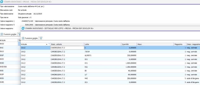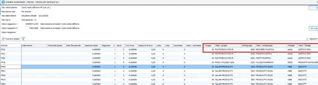 In questa stampa é inoltre possibile visualizzare anche i campi riclassificatori per gruppo merceologico, sottogruppo merceologico, famiglia. Nel caso in cui venga chiesto il dettaglio per lotto, commessa, matricola , ubicazione sarà prodotta una ulteriore griglia con i relativi dati della giacenza e del valore giacenza