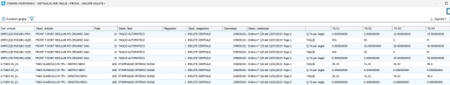 Nel caso di presenza del modulo TCO (taglie e colori) se viene scelto di stampare il dettaglio taglie in tale griglia, per ciascun articolo/fase verranno visualizzate due righe: la prima riporta le descrizioni delle taglie, mentre la seconda riporta la quantità per ciascuna taglia.