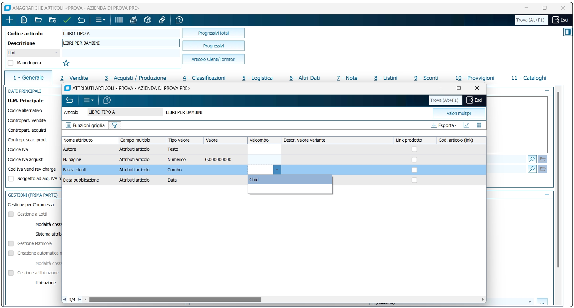 Nel primo caso (codice 1), dall'Anagrafica articolo è richiesto di inserire un testo (il nome dell'autore), nel secondo caso si inserisce un valore numerico (numero di pagine), nel terzo caso occorre scegliere tra valori preimpostati, nel quarto caso si può inserire una data. In fase di creazione nuovo articolo o di duplicazione di un articolo già esistente, la tabella degli attributi, se preimpostati, sarà popolata al primo accesso alla maschera degli attributi e non automaticamente al salvataggio dell'articolo. Descrizione Inserire la descrizione del nuovo parametro; il testo è visualizzato nella schermata richiamabile dall'Anagrafica articoli per la gestione dei campi aggiuntivi. Tipo campo Selezionare il tipo di campo tra quelli proposti. Se si seleziona "valori", occorre impostarli accedendo alla cartella "valori" della griglia. In questo modo è possibile associare una descrizione ad un codice da memorizzare sul database; la visualizzazione della colonna avviene come casella a discesa. Ad esempio, se si vogliono gestire i valori in lingua, occorre settare il flag di getione lingua e inserirli della cartella valori come da immagine: