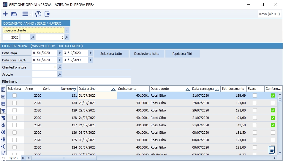 CTRL+F4 (mostra precedenti ordini) quando si è posizionati su una riga del corpo, mostra se ci sono altre righe d'ordine da evadere per quel fornitore/cliente o per quel articolo / fornitore o articolo / cliente. Il programma mostra solo le righe inevase.