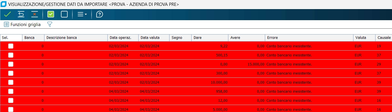 In questo caso la banca non è stata codificata (vedere le prime due colonne vuote). Le righe sono evidenziate in rosso ed è indicato l'errore nella relativa colonna. Inserendo manualmente il codice della banca, è possibile procedere con l'import. Se si è deciso di non importare i movimenti duplicati, tali movimenti sono scartati direttamente durante l'import e non appaiono nella maschera di gestione dati. Cambiando i dati è possibile che il movimento diventi la copia di un altro già presente, in questo caso l'errore viene segnalato in giallo (non bloccante) e l'utente deciderà se procedere o meno con l'importazione.