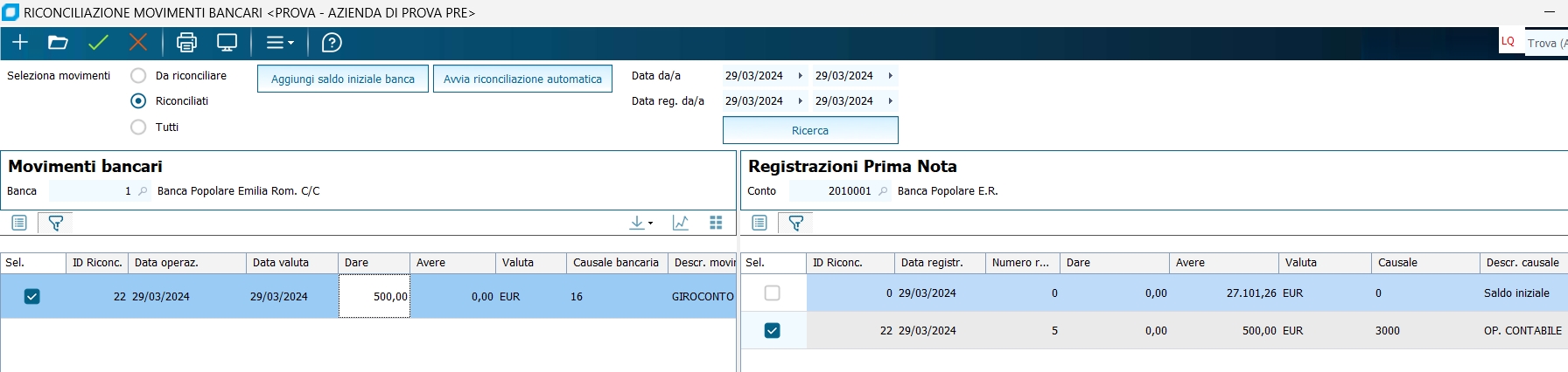 Sui movimenti riconciliati, viene definito un ID di riconciliazione A tale scopo, facendo doppio click su un record riconciliato (in una qualsiasi delle due griglie), vengono visualizzati solo i dati appartenenti alla riconciliazione: