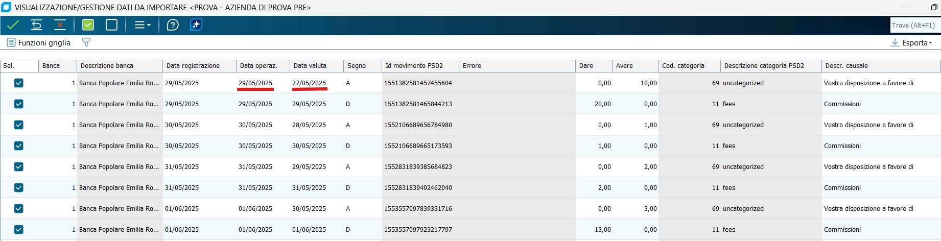 In fase di importazione movimenti bancari con tipo tracciato Standard PSD2, è possibile abilitare a -1 l'opzione di registro BSRCCONS/OPZIONI/UsaDataOperazione_SaltEdge, che permette di riportare come data operazione la data indicata nel campo "extra/posting_date" se prensente nel movimento per distinguere la data operazione dalla data valuta, altrimenti riporta come data operazione la data presente nel campo "made on".