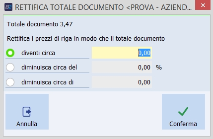 Rettifica Totale Questa funzionalità permette di rettificare il totale della registrazione diminuendo di un importo piuttosto che di una percentuale, oppure inserendo direttamente la cifra del totale, il programma provvederà ha modificare il prezzo di riga per ottenere il risultato desiderato.
