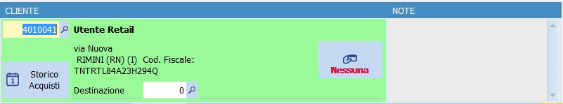 • Se il conto è di tipo Cliente Reale (privato o azienda) verranno mostrate non editabili: le note associate al cliente, il comando che permette di richiamare la maschera di visualizzazione dello Storico Acquisti effettuati ed inoltre sarà possibile associare una destinazione diversa al conto indicato