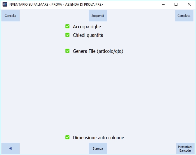 Cancella la lista eliminandola dalle Liste Selezionate Articoli. Sospende la lista e tra le Liste Selezionate Articoli apparirà in stato di sospeso. Conclude la lista e la imposta come Completata tra le Liste Selezionate Articoli. Se la spunta è attiva inserendo 2 volte lo stesso articolo (con anche la stessa fase, lotto, ecc...) la quantità inserita la seconda volta verrà aggiunta alla quantità della prima riga. Altrimenti creerà due righe distinte. Quanto è attiva il programma chiede in fase di riscontro dell'articolo la quantità da assegnare alla riga. In caso non sia attiva considera ogni volta che viene identificato un articolo che abbia quantità 1. Genera File (solo Art./Qta) o (solo BC/Qta) Se è attiva la spunta al completamento genererà un file di testo da poter importare dentro gestione documenti. Se non è stata impostata l'opzione di registro Quanto è attiva la dimensione delle colonne delle griglie viene ridimensionata in automatico in base ai dati che contiene per poter ottimizzare lo spazio nelle griglie. Torna alla schermata di inventario per continuare ad aggiunta di articoli alla lista. Stampa Permette di stampare la lista che si stava generando Permette di associare un barcode sconosciuto ad un articolo. La memorizzazione barcode propone alla fine una maschera per il riepilogo delle informazioni da assegnare e nel campo articolo di tale maschera è presente l'autocompletamento. |