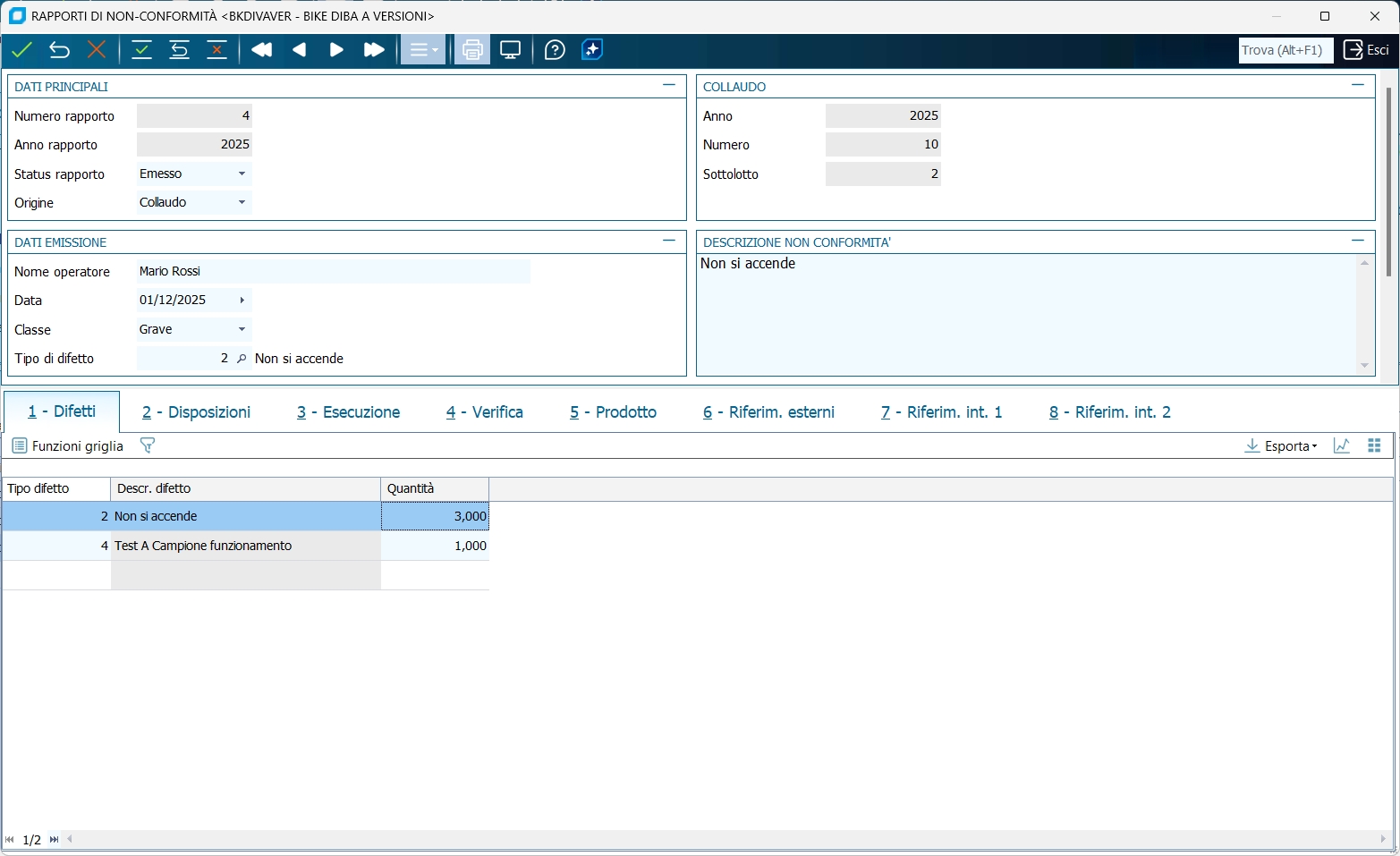 Questo programma permette di redigere i rapporti di non conformita (RNC) a partire da una scheda collaudo risultata non conforme, oppure creare un nuovo RNC a seguito di un reso non conforme da cliente.