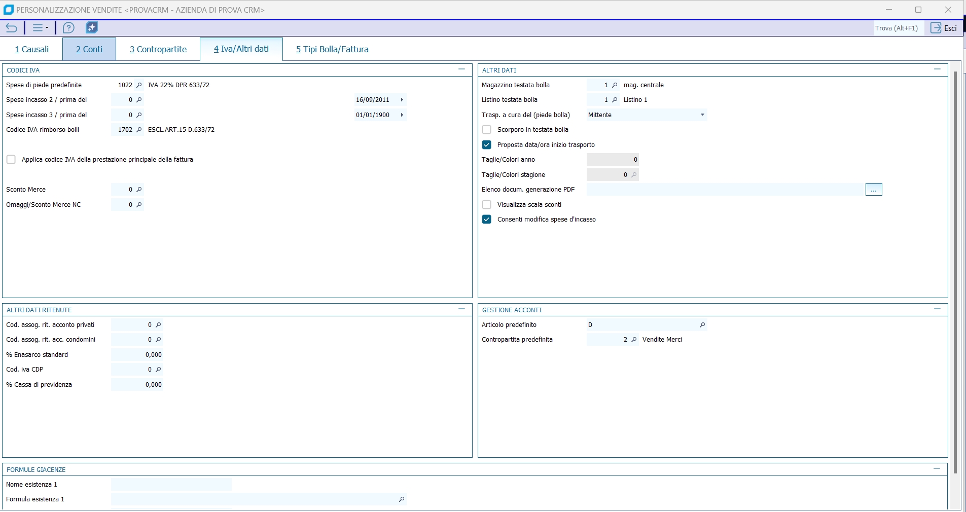 Questo programma gestisce la tabella che contiene le contropartite, escluse quelle relative ad acquisti e vendite, le causali di contabilità ed i codici IVA utilizzati nella contabilizzazioni delle fatture di vendita. La tabella è utilizzata completamente solo se accanto al modulo magazzino e/o il modulo vendite è installato anche il modulo di contabilità generale; in caso contrario, è sufficiente inserire i codici IVA richiesti ed eventualmente il listino costi standard.
