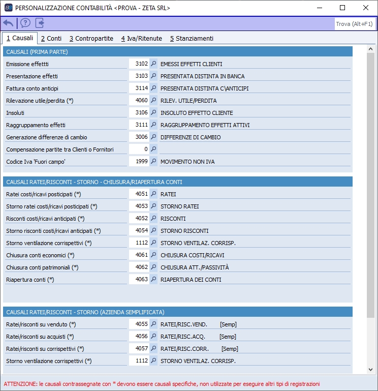 Inserire le causali di contabilità generale usate per la presentazione della distinta antcipi e per la relativa maturazione