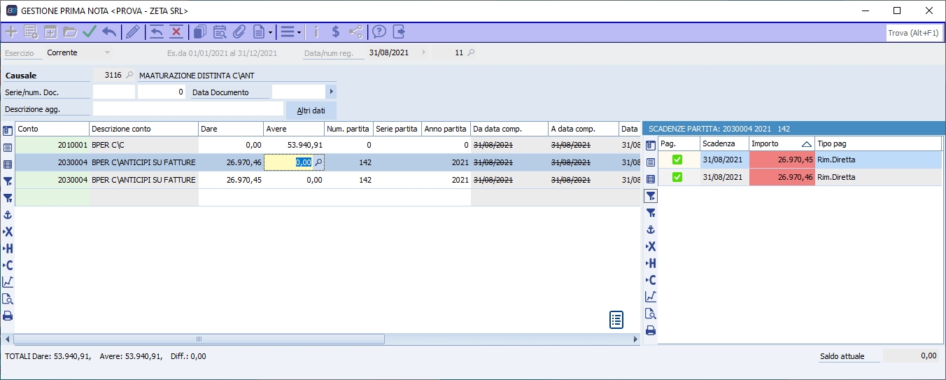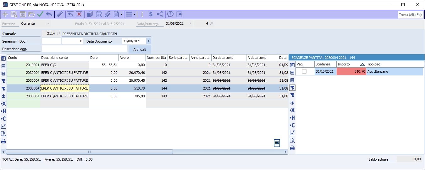 La generazione della distinta ha creato la registrazione di accredito sul Banca conto corrente e di addebito sul Banca c\Anticipi fatture. Sul conto Banca c\Anticipi su fatture viene creata anche la relativa scadenza con le seguenti caratteristiche:con stessa data scadenza della rata presentata, con data scadenza=data della rata presentata, conto=conto anticipi su fatture, numero=numero della fattura, serie serie della fattura, anno=anno della fattura e nel campo sc_controp ci andrà il conto del cliente (an_conto) intestatario della fattura
