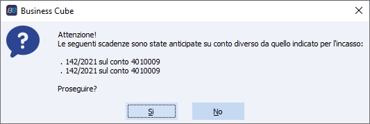 Inoltre se l'incasso viene fatto su un conto diverso (cassa o altra banca) da quello di presentazione sarà dato il messaggio