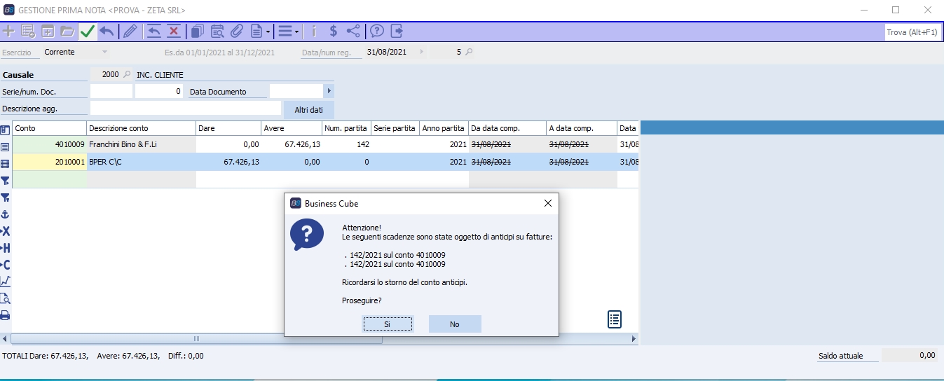 Alla scadenza l'utente dovrà registrare l'incasso delle fatture da prima nota saldando le scadenze sul conto del cliente. Se le scadenze sono oggetto di anticipo verrà dato un messaggio di ricordarsi di registrare anche la maturazione delle rate sul conto anticipi