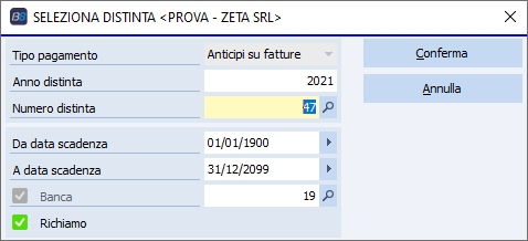 Le scadenze richiamate saranno escluse dalla generazione di una Nuova distinta conto anticipi.