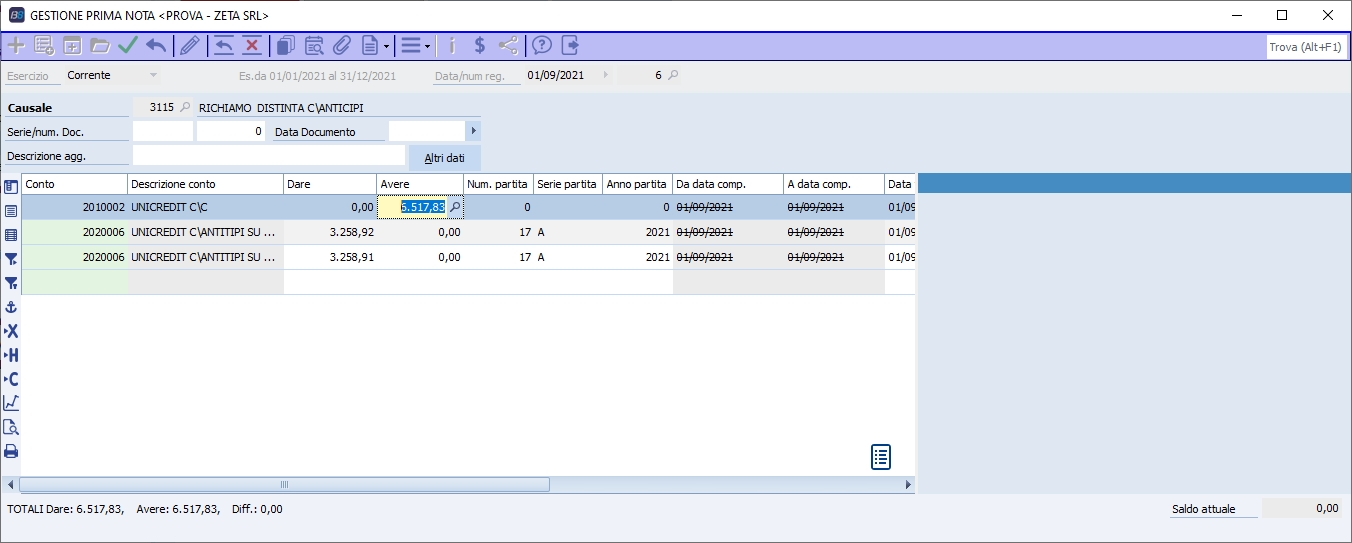 Il richiamo provvederà a stornare il conto corrente che sarà addebitato e a stornare il conto BANCA \CANTICIPI che sarà accreditato