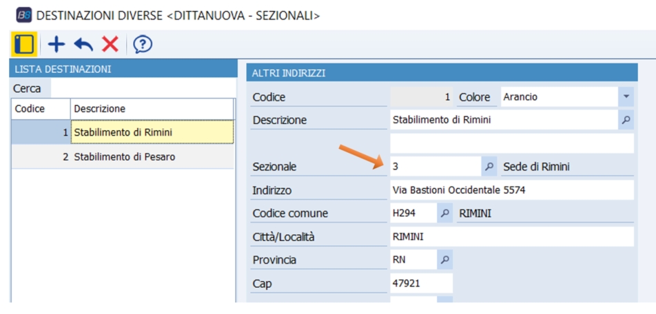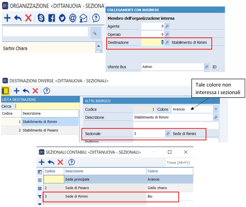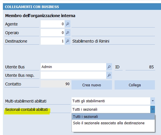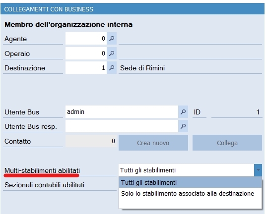 Esempio : All'operatore Sartini Chiara, che è collegato all'utente di Business --> "Admin" ho associato la destinazione diversa --> "Stabilimento di Rimini" e qui bisogna anche indicare se l'operatore può lavorare su tutti i sezionali o solo sul sezionale associato alla destinazione.