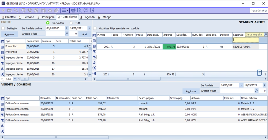 CRM: Gestione lead/Opportunità/Attività Nella griglia delle scadenze è stata inserita la colonna per il sezionale, visibile solo se è attiva tale gestione.