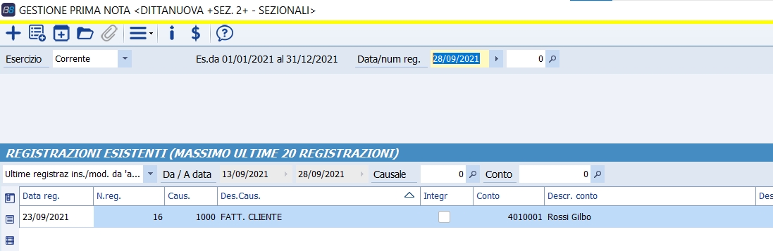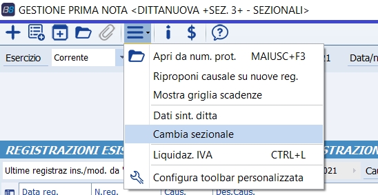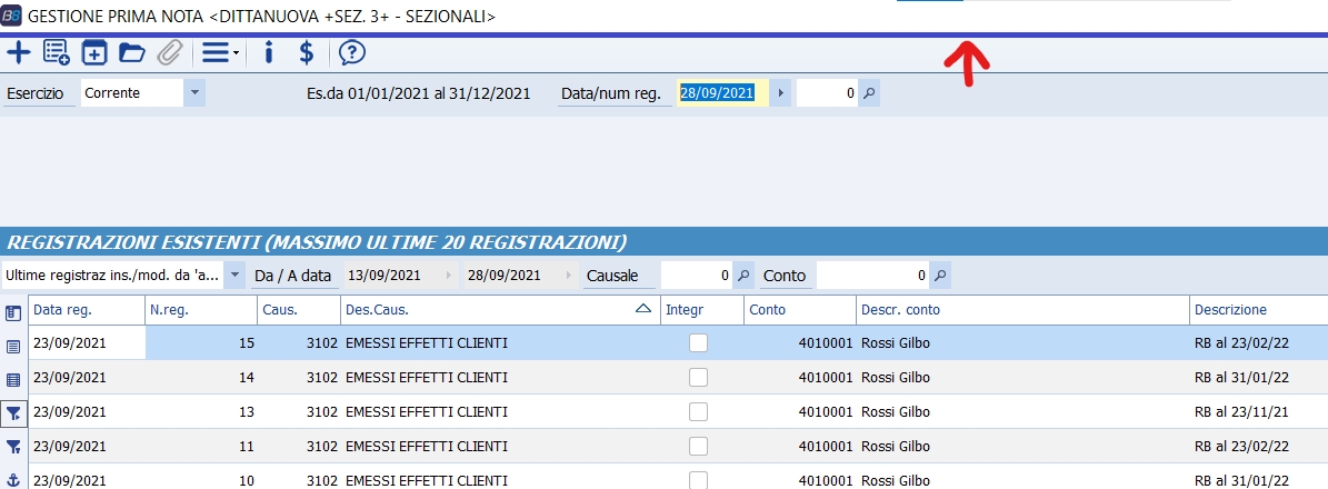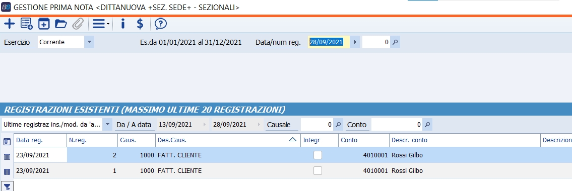 GESTIONE PRIMA NOTA Ad ogni cambio del sezionale, utilizzando la funzione "Cambia Sezionale" presente in strumenti, vengono ricaricate le ultime registrazioni in griglia mostrando solo quelle del sezionale corrente. Sezionale 2