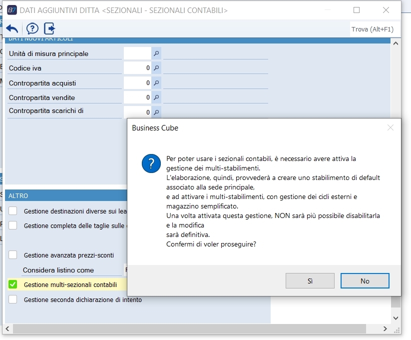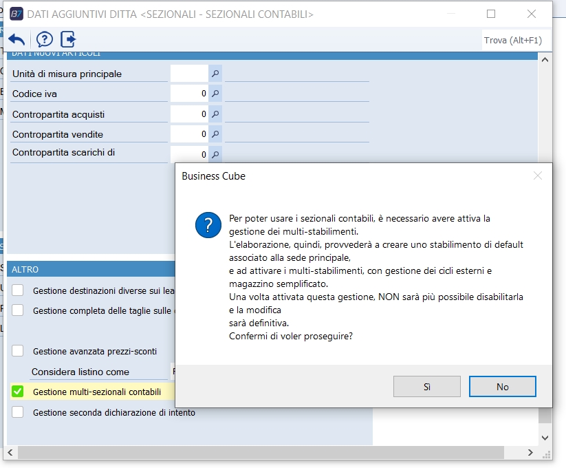 2. Presenza del modulo contabilità e magazzino vendite: come per la gestione precedente, in attivazione del flag di "Gestione multi-sezionali contabili" verrà restituito il messaggio sotto allegato che avverte che per poter utilizzare i sezionali contabili è necessario avere attiva la gestione dei multi-sezionali e che l'elaborazione provvederà alla creazione automatica dello stabilimento di default associato alla sede principale, ad attivare i multi-stabilimento con gestione dei cicli esterni e megazzino semplificato. Dopo di ché bisognerà svolgere i passaggi sopra elencati per collegare i sezionali con la destinazione diversa.