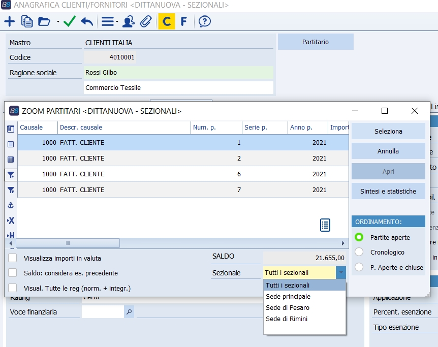 Se invece richiamo lo zoom partite da Anagrafica clienti/fornitore, è possibile scegliere il sezionale su cui poter visualizzare le partite.