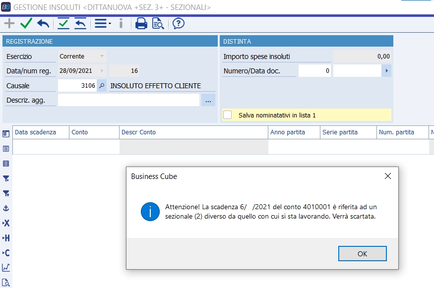 GESTIONE INSOLUTI Dal programma gestione insoluti, nel momento in cui filtro le scadenze che voglio rendere insolute, mi verranno mostrate solo le scadenze del sezionale corrente su cui sto lavorando..Ovviamente anche da tale programma è possibile utilizzare la funzione "Cambia Sezionale" se l'utente è abilitato alla gestione di tutti i sezionali. Se invece lavoro con l'importazione da file esterno occorre specificare il sezionale su cui lavorare.. se nel file che sto importando sono presenti scadenze che non fanno parte del sezionale corrette, il programma avvisa e scarta l'importazione della scadenza.