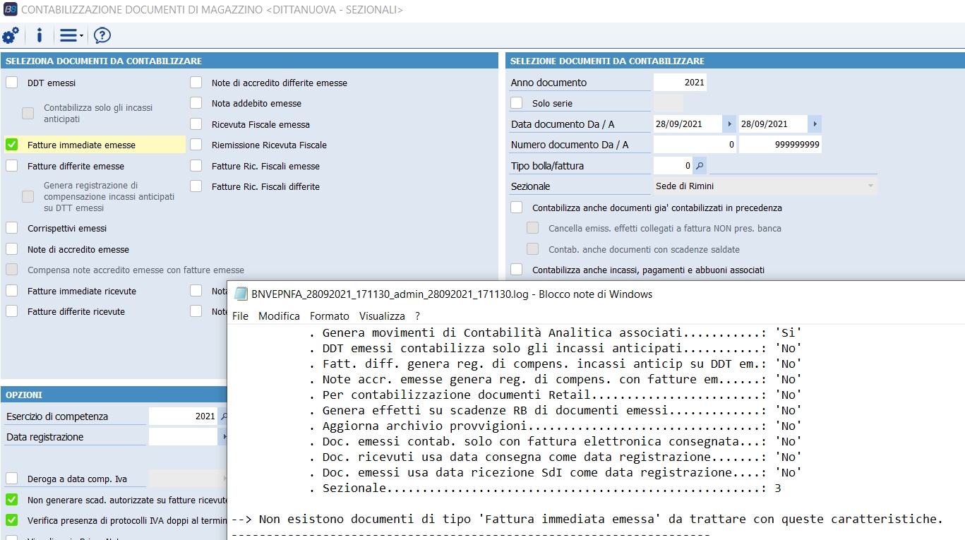CONTABILIZZAZIONE DOCUMENTI DI MAGAZZINO All'interno del programma contabilizzazione documenti di magazzino è stata inserita la combo dei sezionali contabili, le registrazioni vengono create sul sezionale associato alla destinazione diversa collegata allo stabilimento del magazzino di testata della fattura.