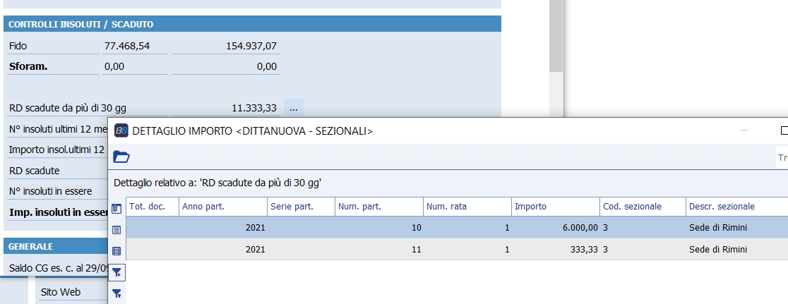 Se invece si entra nel dettaglio (ex. RD scadutre da più di 30 gg) vengono visualizzati solo gli importi del sezionale abilitato per l'utente riportando in griglia anche la descrizione del sezionale.
